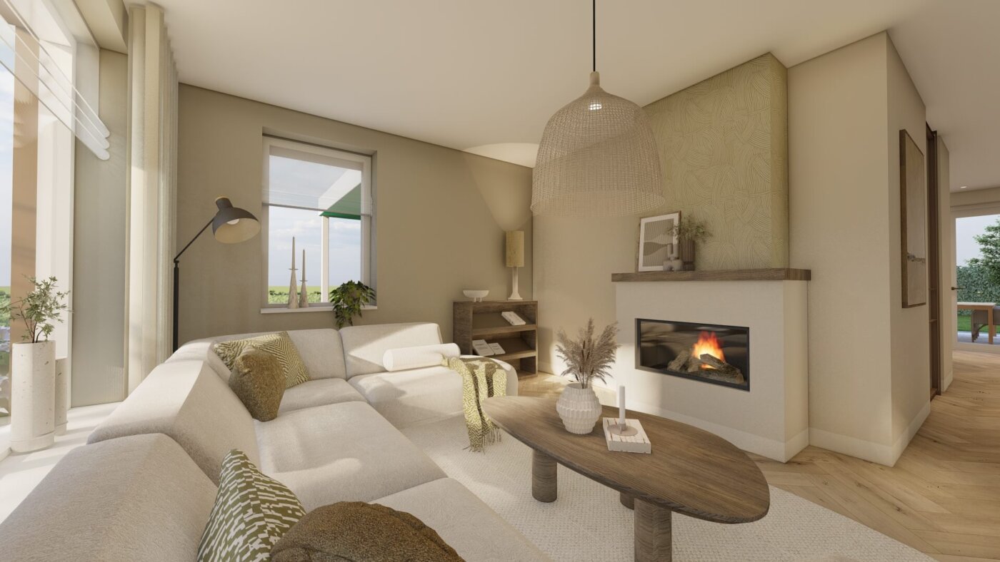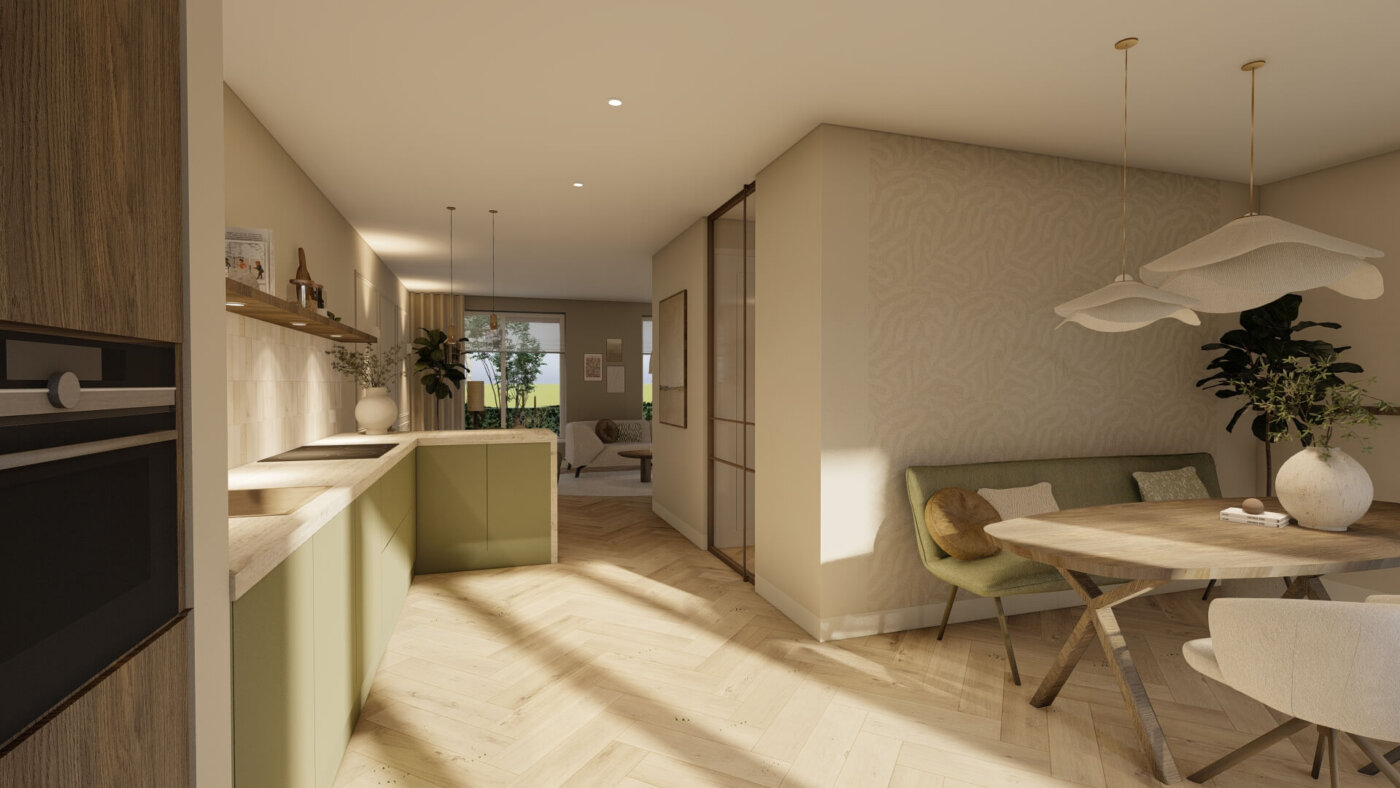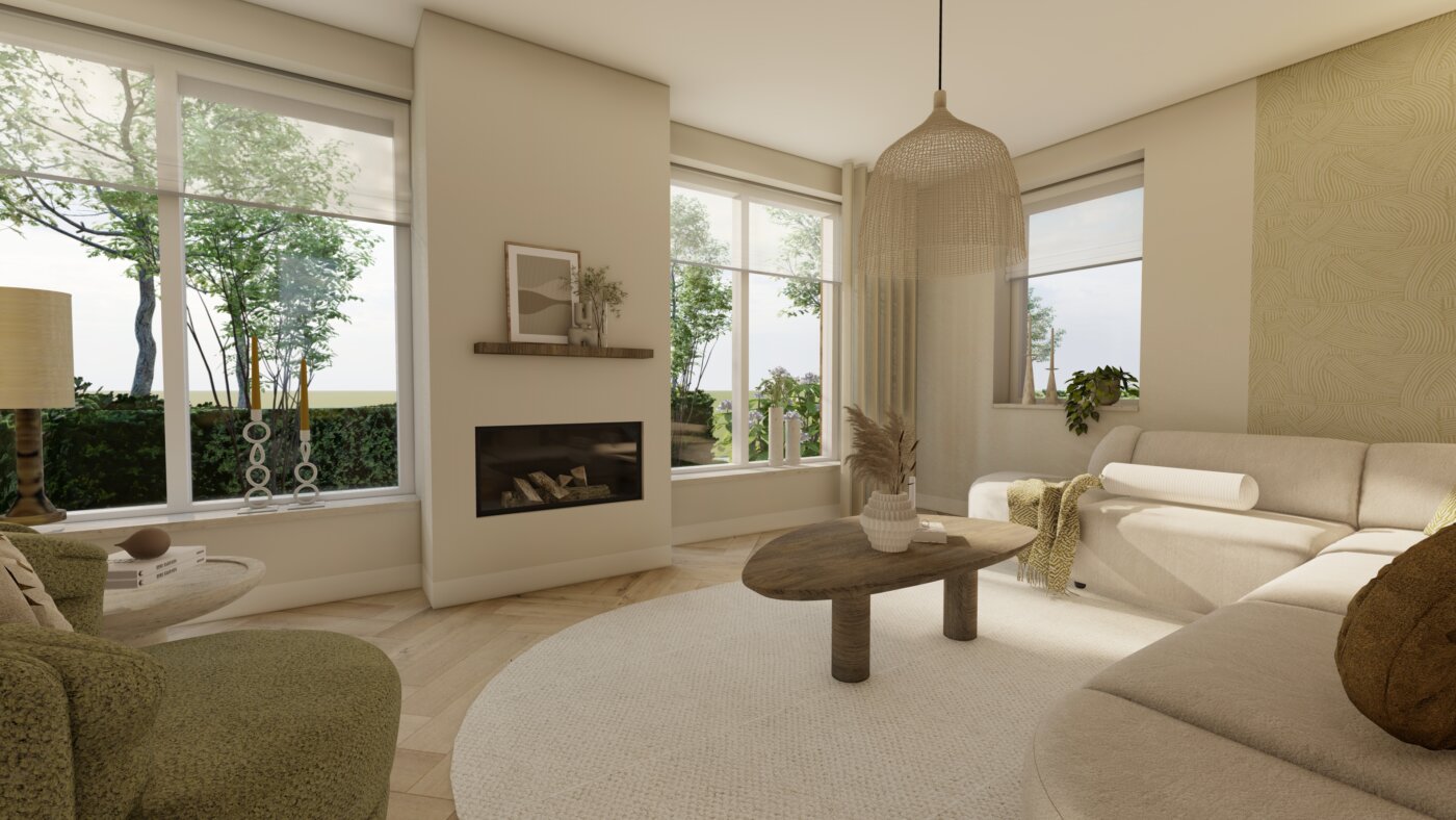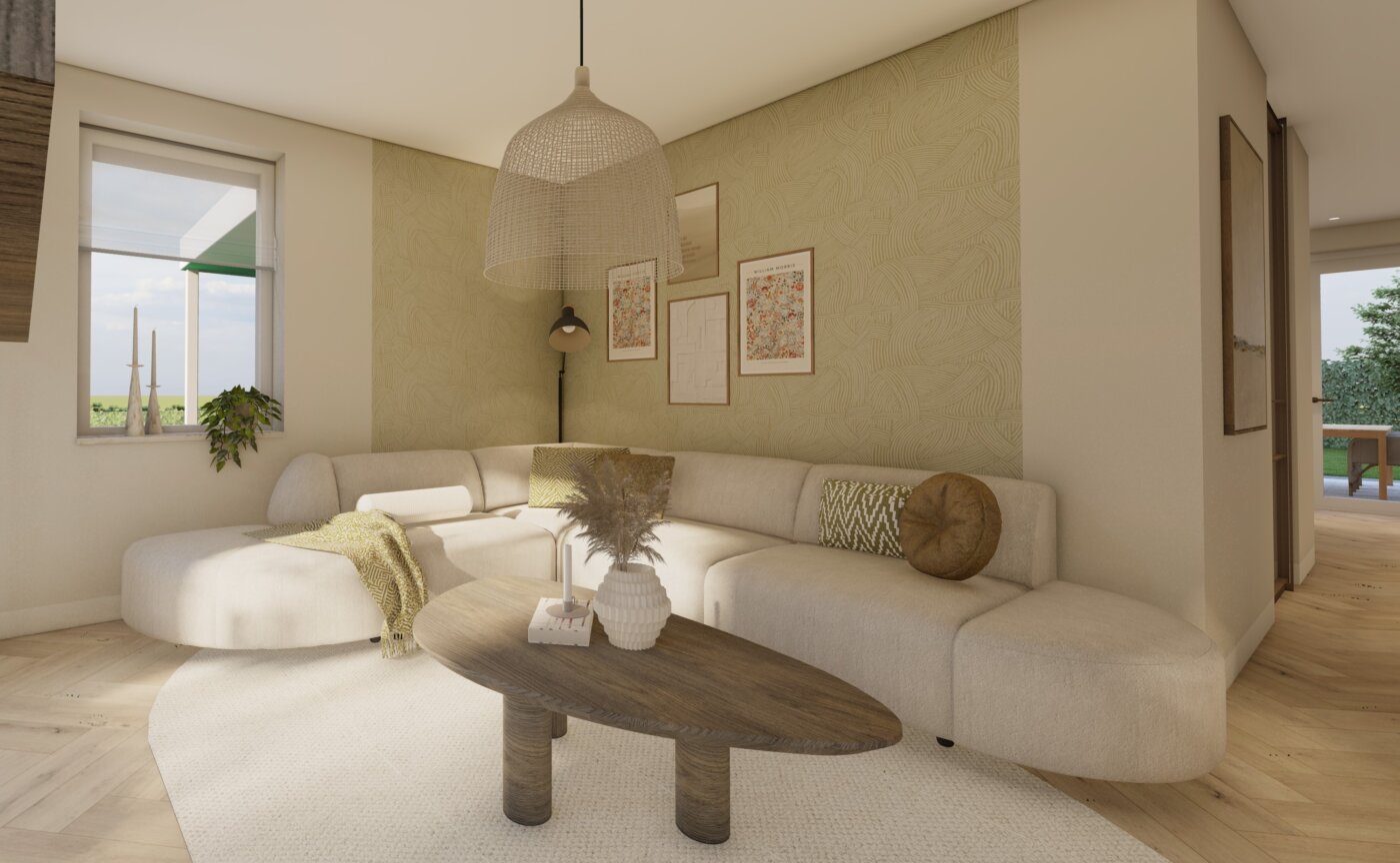 De woonkamer straalt rust en warmte uit door het gebruik van zachte beigetinten, groene accenten in het behang en natuurlijke materialen. Met de 3D-visualisaties krijgt de klant een realistisch beeld van het ontwerp en kan er gericht worden gekozen. Als er meerdere mooie opties voor een indeling zijn, zoals in deze situatie, breng ik ze beide in beeld. Zo is het voor de klant makkelijker om een keuze te maken.