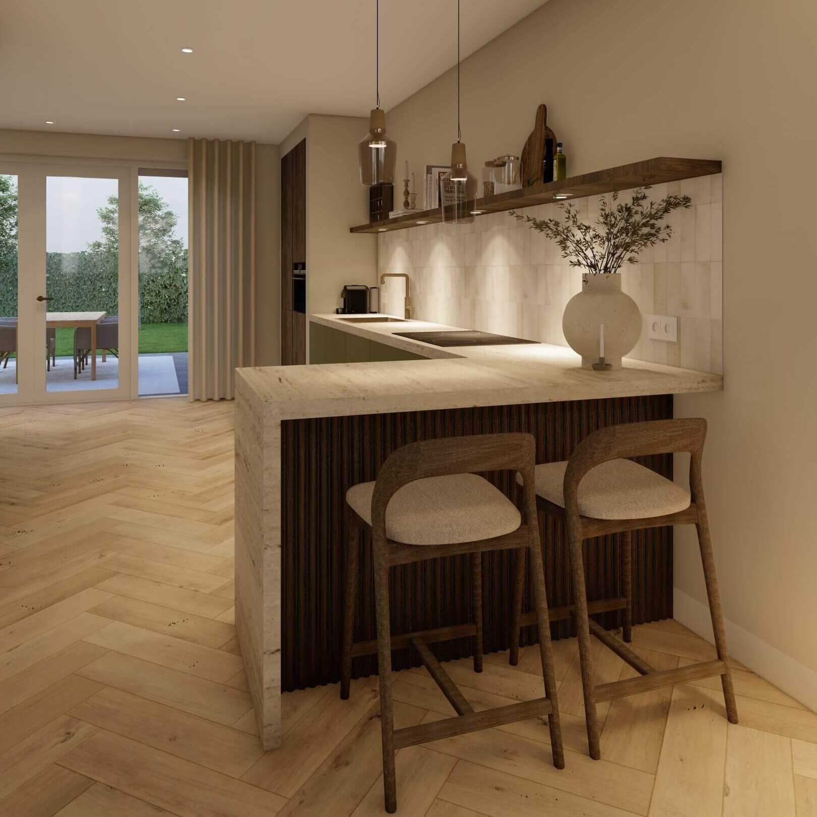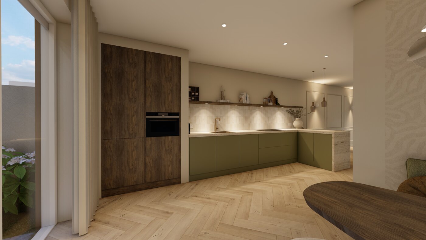 Door de keuken op een slimme positie in de ruimte te plaatsen, is er meer ruimte ontstaan rondom de keuken en eettafel, met een directe verbinding met de woonkamer tijdens het koken. De olijfgroene kastjes in combinatie met warme houten accenten geven de keuken sfeer en karakter. Het lichte travertin werkblad en de authentieke tegels, subtiel uitgelicht door verlichting in de plank, zorgen voor een sfeervol geheel. Zo voelt de keuken niet alleen functioneel, maar ook warm en uitnodigend aan.