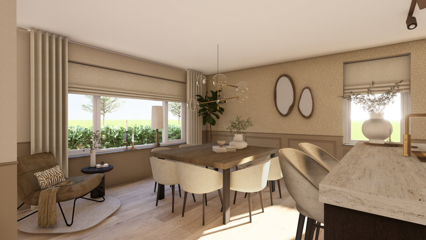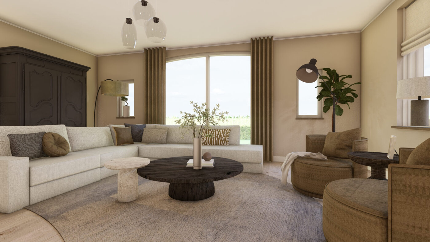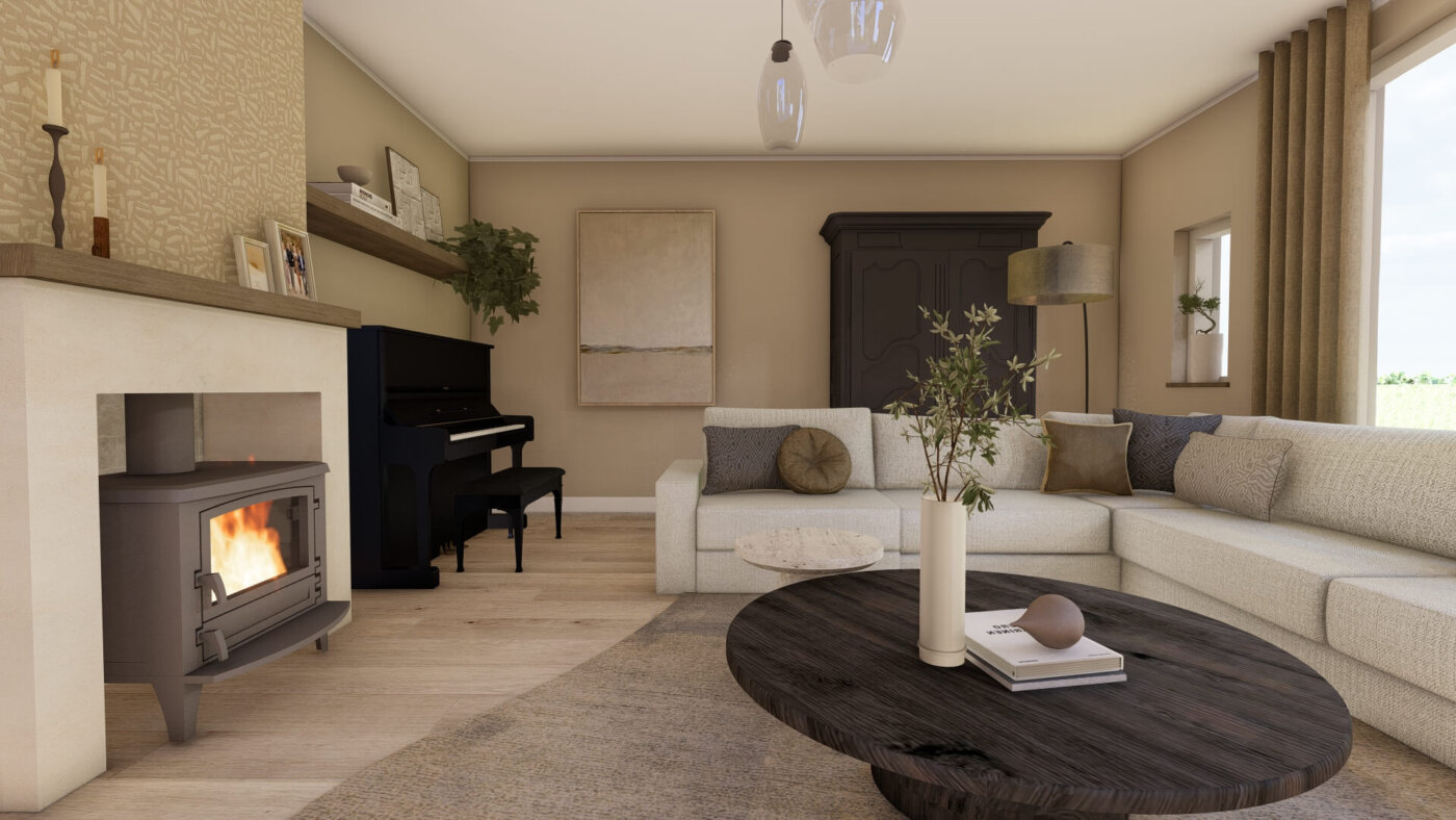 Deze woonkamer straalt warmte en gezelligheid uit, met de kachel en schouw als sfeervol middelpunt. Het vuur brengt niet alleen comfort, maar geeft de ruimte ook karakter en gezelligheid. Zachte aardetinten, natuurlijke materialen en verfijnd behang versterken de landelijke chique uitstraling.