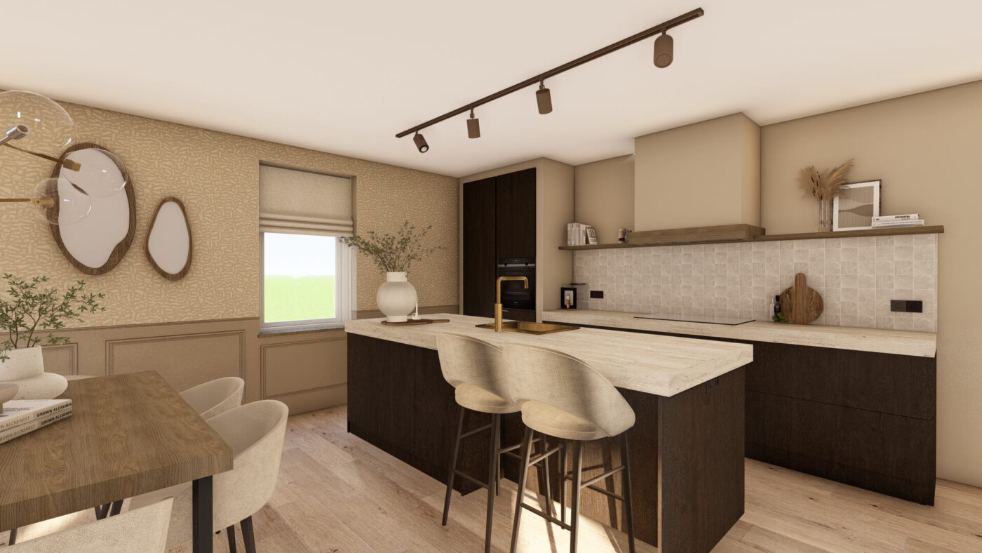 Deze leefkeuken vormt het warme hart van de woning. Het royale kookeiland, de lambrisering, authentieke tegeltjes en het sfeervolle behang geven de ruimte karakter en sluiten mooi aan bij de uitstraling van de boerderij.