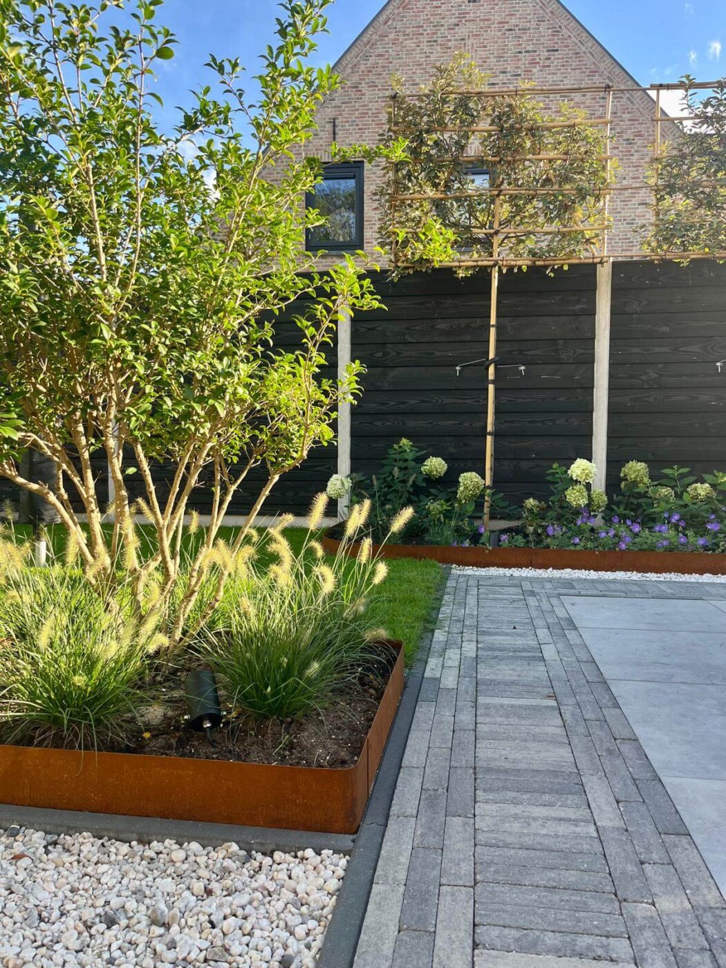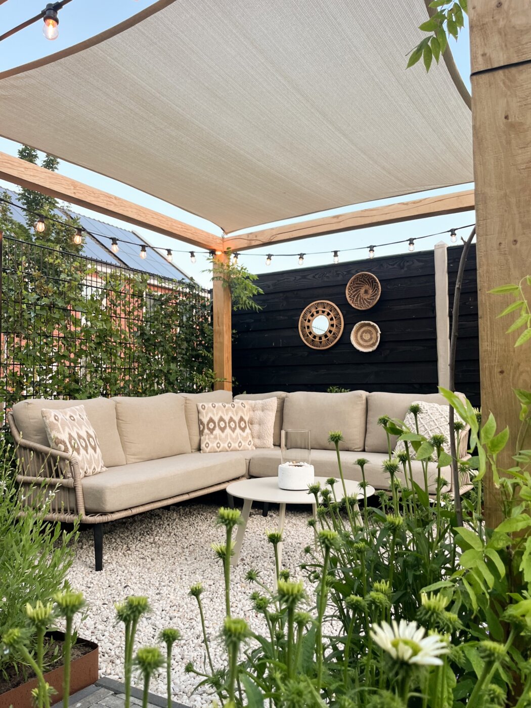 Ook de tuin is zorgvuldig meegenomen in het ontwerp van de woning. Een houten pergola met zonnedoek zorgt voor een aangename, schaduwrijke zitplek. De verschillende plantenborders creëren diepte en vormen als het ware meerdere ‘kamers’ in de tuin, waardoor deze optisch groter oogt. Zo is er een groene, uitnodigende tuin ontstaan waarin je op verschillende momenten van de dag comfortabel kunt verblijven en optimaal kunt genieten van het buitenleven.