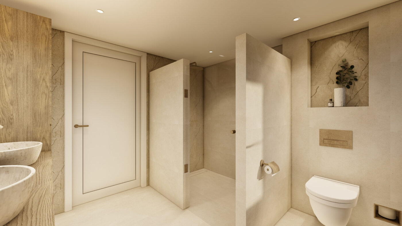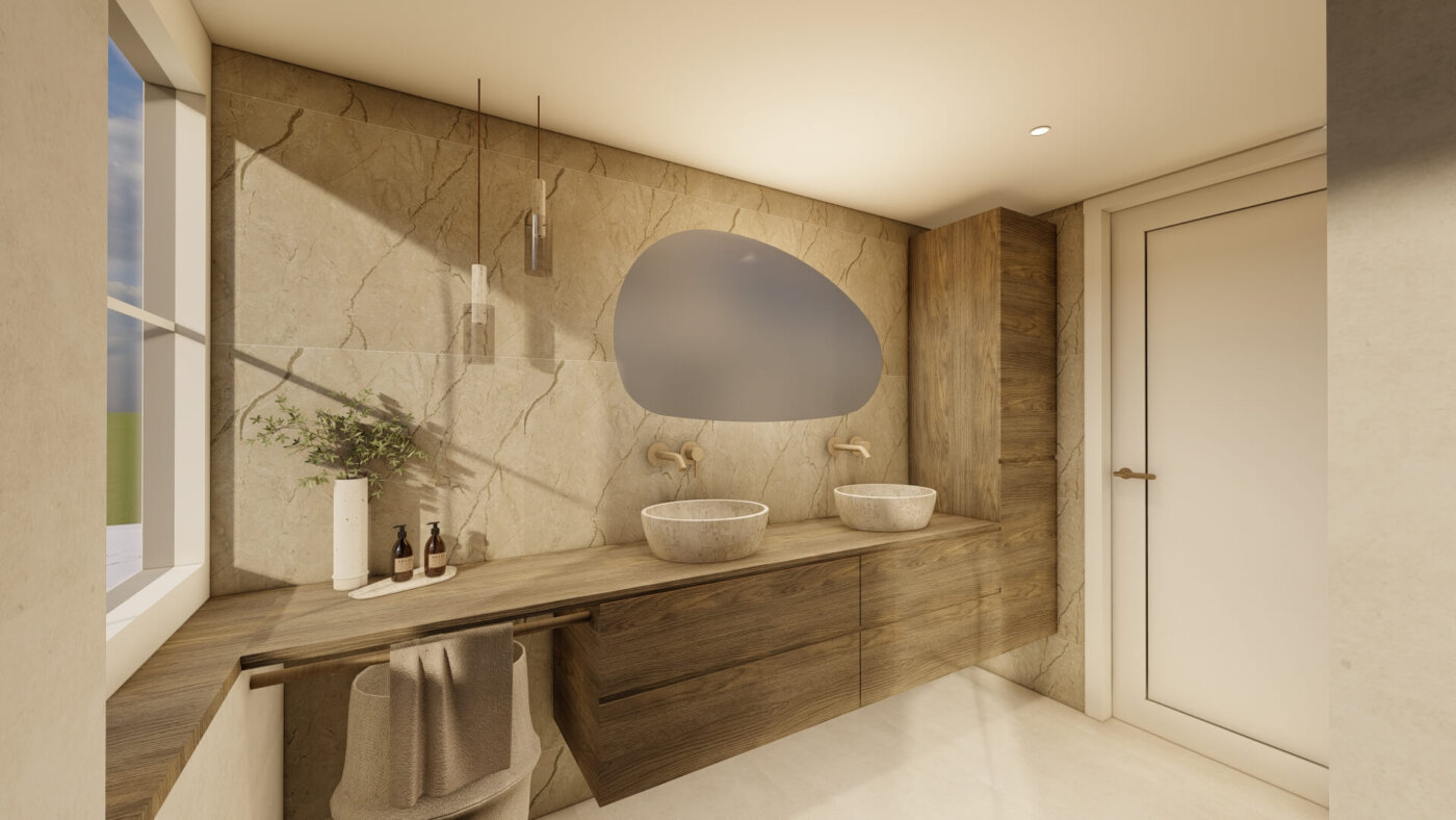 In de badkamer is de warme Japandi stijl doorgetrokken, waardoor de woning één geheel vormt. Beige en bruintinten, natuursteen met aders en walnoot accenten zorgen voor rust en een tijdloze uitstraling. Het maatwerk wastafelmeubel en de inloopdouche geven de ruimte een ruimtelijk en luxe uitstraling.