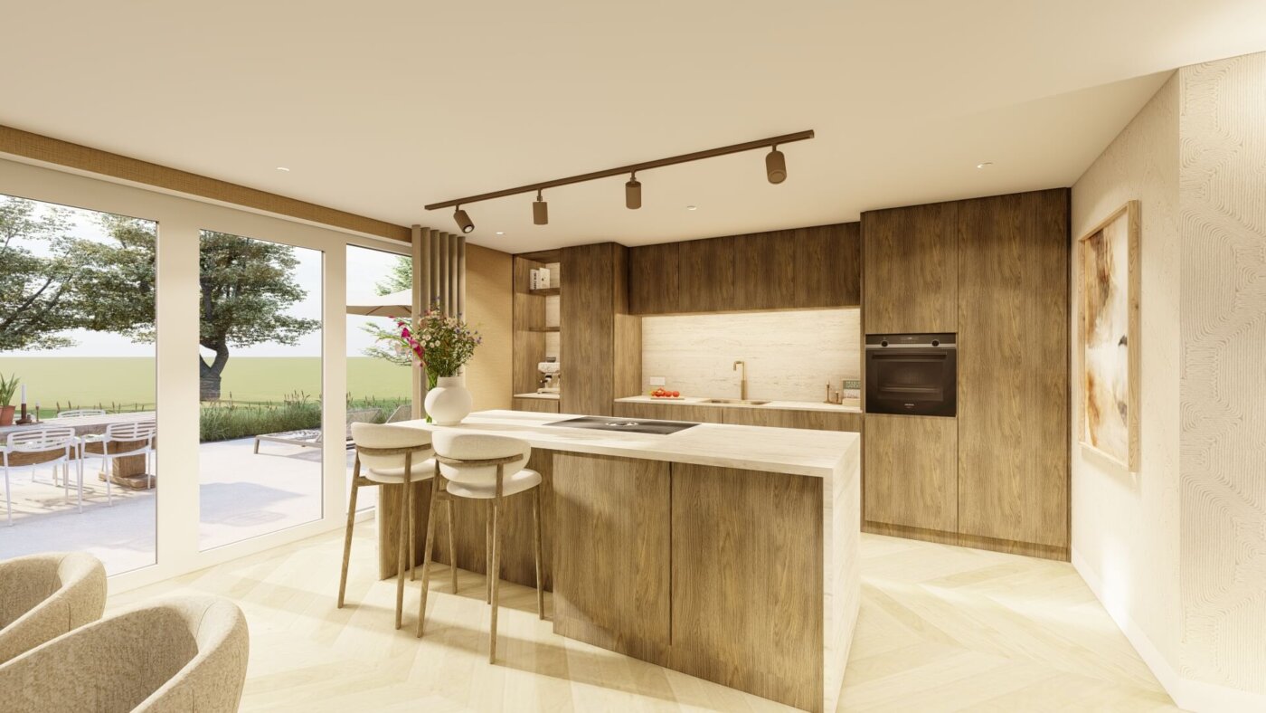 Het royale kookeiland vormt het hart van de keuken en is mogelijk gemaakt door de uitbouw met een grote glazen pui. Hierdoor is veel licht en ruimte ontstaan, wat zorgt voor een open en ruimtelijk gevoel. De lichte natuurstenen afwerking combineert mooi met het warme hout en geeft de keuken een tijdloze uitstraling. De zitplaatsen aan het eiland maken de keuken een fijne plek om samen te komen. Aansluitend ligt een sfeervolle zithoek, waar de doorkijkhaard zorgt voor warmte en gezelligheid.